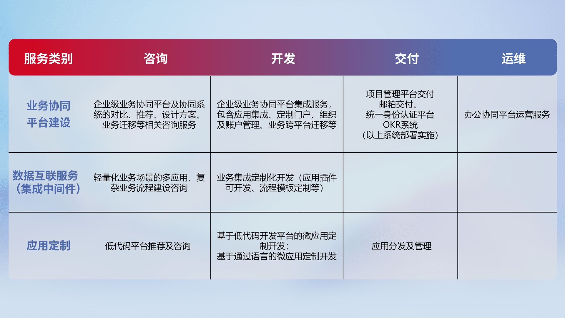 针对钉钉、、、、企微、、IDaas等平台级产品提供产品的规划、、、方案、、、交付、、、、定制化开发等服务,,,,实现如统一协同办公、、智能客户服务、、混合会议管理、、智能数据查询、、等业务场景,,,实现数字化转型。。